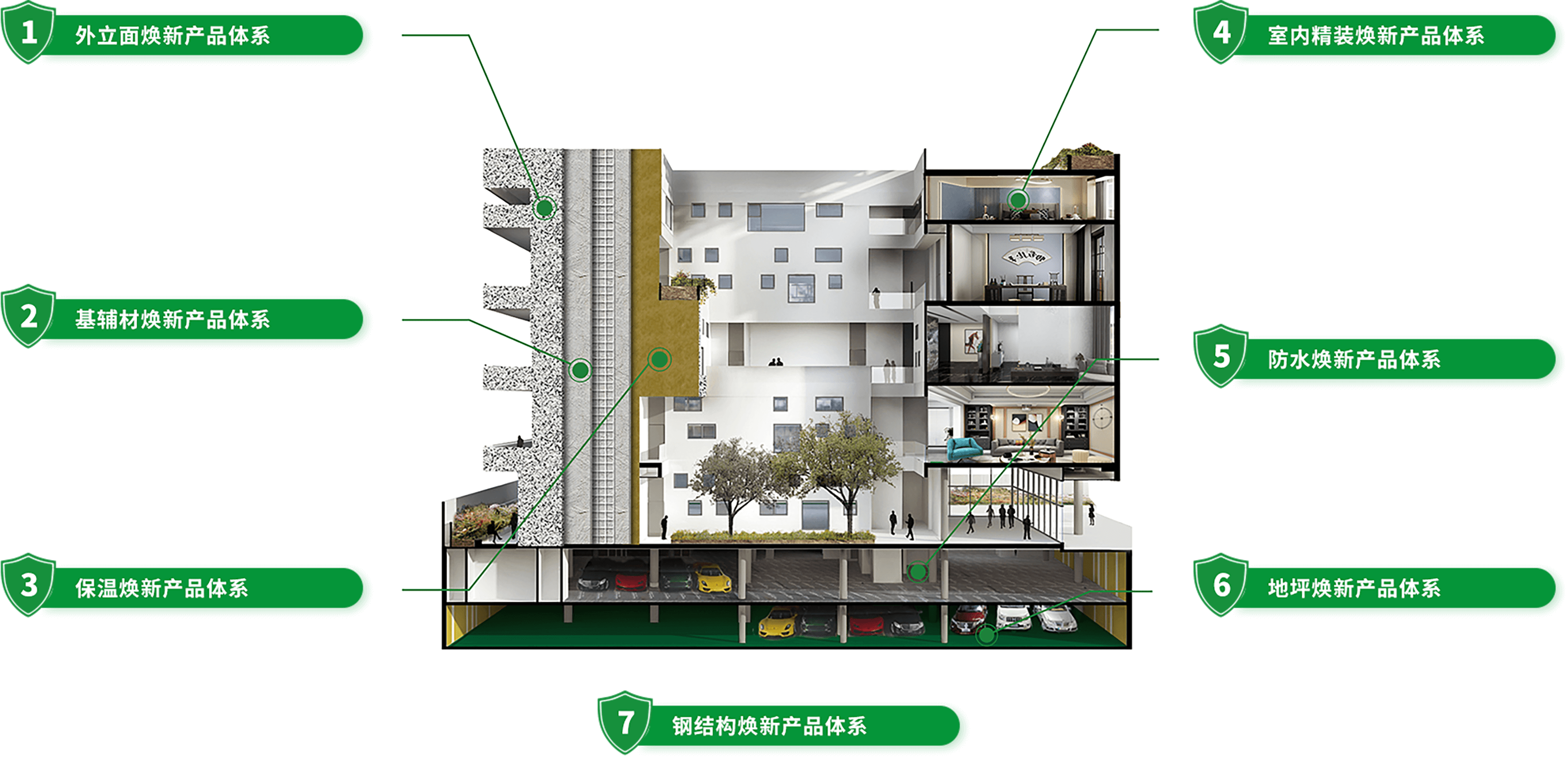 基于三棵樹工程“七位一體”產(chǎn)品體系構(gòu)建了綠色、節(jié)能、低碳的城市煥新渠道產(chǎn)品體系,并持續(xù)升級(jí),滿足日益增長(zhǎng)的行業(yè)環(huán)保需求與可持續(xù)發(fā)展目標(biāo)。